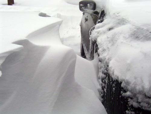 Here is what the drift around the cars looked like. The wind created these strange canyon-like walls in the snow around the cars. Look close, you can see a couple of buried cars across the street.