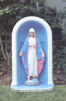 One thing that baffles me even more is a phenomenon that I didn't quite really get to see until I moved to the East which is much more predominately Catholic than the west side of our country. Not only more Catholic, but much more ethnic as well. I've noticed that immigrants have tended to be much more showy about their religious leanings than we Americans (note this is very much a generalization) and one of the places where this is quite evident is my Portugese (NO I DO NOT SPEAK THE LANGUAGE SO DO NOT WRITE TO ME IN IT) and Brazilian neighborhood. Every other house with a yard in my area has a bathtub Mary. I'm not talking about a simple figurine of the Virgin decorating a corner flowerbed, I'm talking about a predominately placed Virgin Mary shrouded by a bathtub shape(which I have discovered in my lawn ornament research to be called a "grotto"). They are EVERYWHERE around here. Can't go a full block without seeing at least one if not two or three. I don't understand it. Then again I'm always a bit baffled by the Catholic obsession with iconography when it comes to the Virgin. I think it makes less sense to me in my neighborhood because over half of these statues are grubby, covered in dirt and grime, chipped or broken or just surrounded by junk. There is one house a couple blocks away that has several bathtub Marys in their yard (which is not grass but blacktop) accompanied by a complete Nativity scene (with a bevy of saints standing around looking at the plastic Jesus as well) in a Taj Mahal style house with a glass front. They light candles in there at night. But the worst part is that the yard around this strange house is covered in broken toys, garbage, dog shit and just plain filth. I don't understand it. Personally if I were to place some religious belief in a statue or an icon that represents my faith, I would uphold it...keep the area around it sacred. I just don't get it. This is not an isolated incident...I see similar yards with similar bathtub Marys in junk covered yards all over the East. In the west you would see plastic lawn ornaments surrounded by abandoned cars (bigger yards there than here) and broken plastic toys...but here it's not the same without your token bathtub Mary.